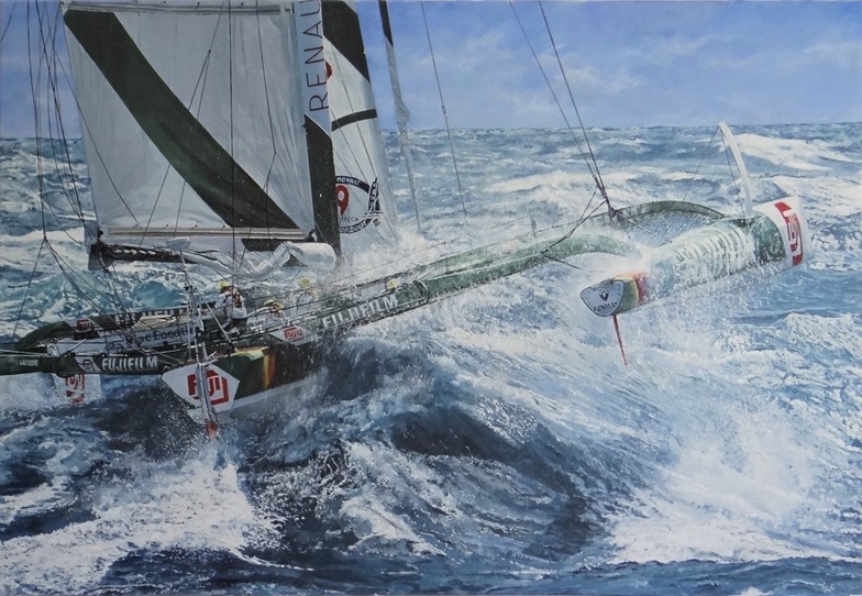 Marynistyka malarstwo Prezentuję jeden z moich obrazów/ który pokazuje dynamikę i magię żeglarstwa oraz piękno wzburzonego oceanu. Obraz olejny trimaran "Fuji" o wymiarach 100 x 70 cm. Oczywiście, jak zwykle proszę o udostępnienie . I would like to present one of my paintings showing the dynamics and magic of sailing and the beauty of the storm ocean. Oil painting trimaran "Fuji" measuring 100X70 cm. Painting based or inspired by of the photo Gilles Martin-Raget prezent.