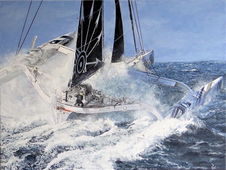 Marynistyka, malarstwo marynistyczne, bardzo widowiskowy obraz trimarana o wymiarach 80X60cm. Jak widać na nim oni na pewno nie uniknęli przemoczenia.