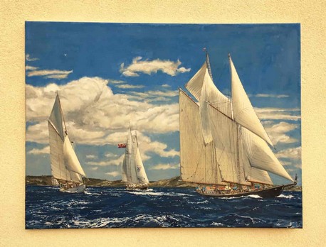 Obraz w wakacyjnym nastroju i kolorach pt " Regaty żaglowców ". Obraz olejny o wymiarach 80X60cm. I present my new painting in a holiday mood and colors entitled " Sailing Regatta ". Oil painting with dimensions of 80x60 cm.