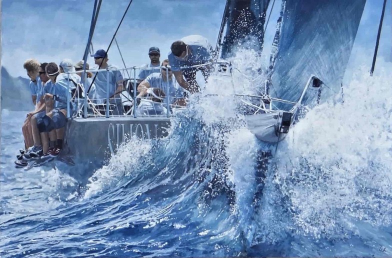 Marynistyka malarstwo. Jeden z moich bardziej interesujących obrazów z serii "Regaty". Obraz pełen dynamiki ze wspaniałą, spienioną wodą . Aby uzyskać ten efekt to tysiące dotknięć pędzla. Obraz olejny o wymiarach 90X60cm. I show one of my most interesting paintings from the Regatta series. Painting full of dynamics with splendid, foamed water. Thousands touches of the brush were made to achieve this effect. Oil painting with dimensions 90x60cm. prezent dla żeglarza