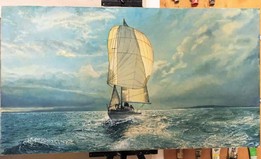 Nostalgiczny obraz żeglarski z cyklu "Kolory wody". Obraz w panoramicznych wymiarach 50X80cm . I present a nostalgic painting from the series "Colors of water". It is in a panoramic size of 50X80cm.